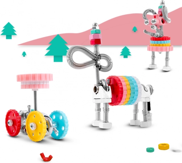 - Stavebnica 3 v 1, farebné matice, skrutky, tvarované bity, náradie na zostavenie