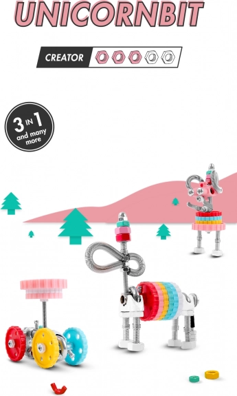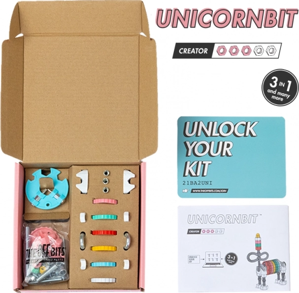 Magický JednorožecBit prináša deťom svet plný fantázie a technickej zručnosti. Z jednej sady postavíte 3 rôzne modely – JednorožecBit, rozprávkového RobotBit alebo AutoBit – a vďaka kompatibilite s bežnými predmetmi doma vytvoríte aj vlastné jedinečné vynálezy.