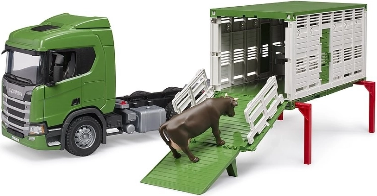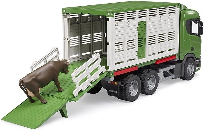Realistický prepravník zvierat BRUDER na podvozku SCANIA poteší malých farmárov skvelými funkciami a pevným spracovaním. Ponúka sklopné a výsuvné rampy, otváracie dvere, sklopné zrkadlá aj vnútorné deliace brány. Súčasťou je figúrka kravy, mäkké behúne pneumatík pre tichú jazdu a možnosť doplnenia o svetelný a zvukový modul pre ešte väčší zážitok z hry.