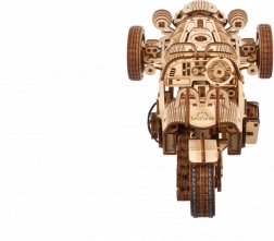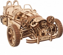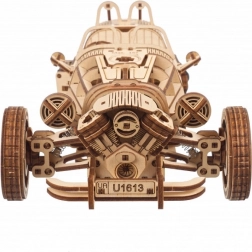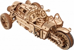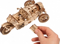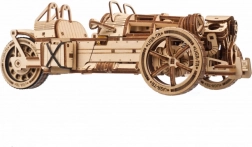 Trojkolka UGEARS UGR‑S kombinuje klasický automobilový šarm s premyslenou mechanikou. Pružinový motor a reťazový pohon rozhýbu zadné koleso, model je plne riaditeľný a dokáže prejsť približne 4 metre priamym smerom. Prepínačom prevodovky ľahko zvolíte režimy Park/Drive a pri jazde uvidíte v akcii krásne spracované piesty aj ozubené kolá.
