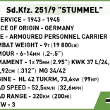 Tento realistický model polopásového transportéra Sd.Kfz. 251/9 „Stummel“, vyzbrojeného krátkohlavňovým kanónom 7,5 cm Stu.K.37, vznikol v presnej mierke 1:35, aby dokonale zapadol do série COBI Historical Collection. Vďaka farebnej kamuflážnej potlači, pohyblivým pásom a kolesám s gumovými pneumatikami ponúka stavebnica autentický vzhľad aj skvelú hrateľnosť.