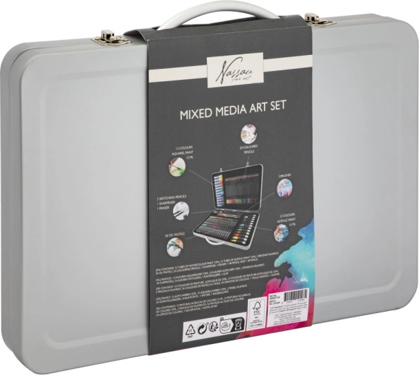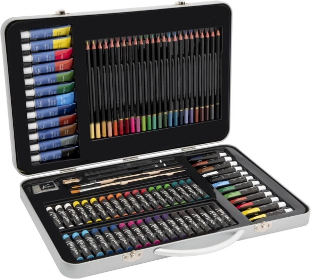 Skvelá voľba pre umelcov, táto sada výtvarných potrieb je uložená v elegantnom plechovom kufríku, ktorý obsahuje všetko, čo potrebujete pre svoju kreativitu na cestách.