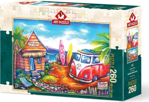 Objavte pohodovú atmosféru letného dňa pri mori so skladačkou Surfársky kemp. Puzzle od ART PUZZLE s 260 dielikmi je ideálnou voľbou na chvíle relaxu a rodinné skladanie, počas ktorých si vyčistíte hlavu a poteší vás hotový obrázok s rozmermi cca 48 × 34 cm.