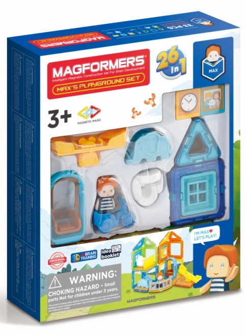 Užite si zábavu s Maxom a jeho ihriskom. Kreatívna magnetická stavebnica umožňuje zostavovať veľké množstvo trojrozmerných objektov pomocou dvojrozmerných plastových mnohouholníkov. Magformers precvičuje jemnú motoriku, podnecuje tvorivosť, učí deti farby a základné geometrické tvary. Rozmery dielov a vhodne zvolené tvary zabezpečujú maximálnu možnú bezpečnosť hračky. Materiál, z ktorého je stavebnica vyrobená, spĺňa najprísnejšie hygienické a zdravotné kritériá. Diely sú dostatočne veľké, nedajú sa prehltnúť a sú prakticky nerozbitné. Balenie obsahuje: