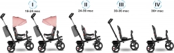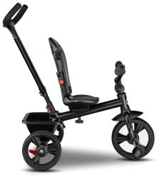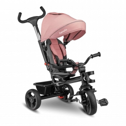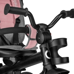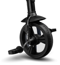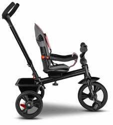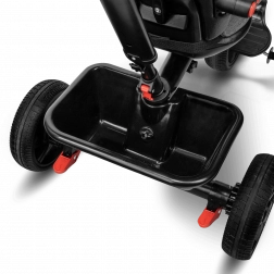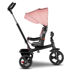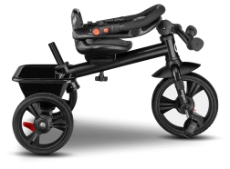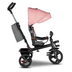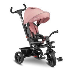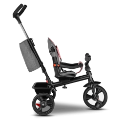 Pre maximálne pohodlie je tu nastaviteľná strieška s priehľadovým okienkom, polohovateľná rukoväť pre rodiča a praktická výbava – košík, taška a držiak na fľašu. Bezpečnosť zvyšujú 3-bodové pásy, madlo, reflexné prvky a dva nezávislé zadné brzdové mechanizmy. Trojkolka sa ľahko skladá do kompaktnej veľkosti a po zložení ju možno pohodlne prenášať vďaka integrovanej rukoväti.