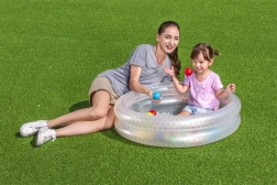 Univerzálny bazénik/ball pit s rozmermi 91 × 20 cm sa hodí do obývačky na koberec aj na záhradu. Dva rovnaké nafukovacie prstence vytvárajú stabilné a mäkké bočnice, ktoré zvyšujú pohodlie aj bezpečie pri hre. Predom testovaný, odolný vinyl a bezpečnostné ventily pomáhajú udržať vzduch vo vnútri a predlžujú životnosť výrobku.