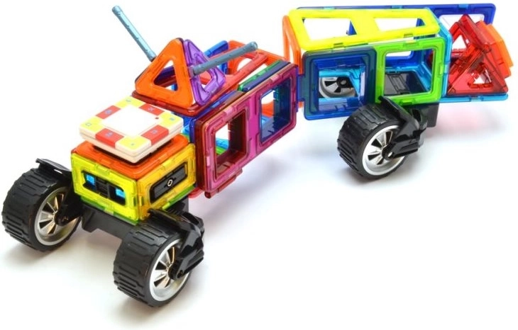 Box je ideálny na stavbu pojazdných robotov s voľne nastaviteľnými ramenami, ale aj motocyklov, truckov a prívesov. Tri trojboké nástavce a bohatá sada obdĺžnikov pomôžu vytvárať pevné kostry do výšky aj dĺžky. Deti si vyskúšajú prácu s magnetickými spojmi, rozvinú fantáziu, priestorové vnímanie a jemnú motoriku. Diely sú bezpečné, odolné a kompatibilné s GEOMAG.