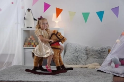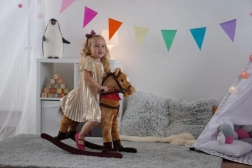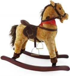 Tento hnedý hojdací koník je vyrobený z kvalitného, na dotyk hebkého plyšu, ktorý láka k pohladeniu aj bezpečnej hre. Realistické spracovanie s uzdou, sedlom a strmeňmi podporuje detskú fantáziu a premení každú izbu na malý ranč.