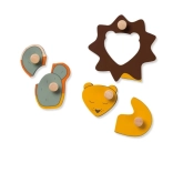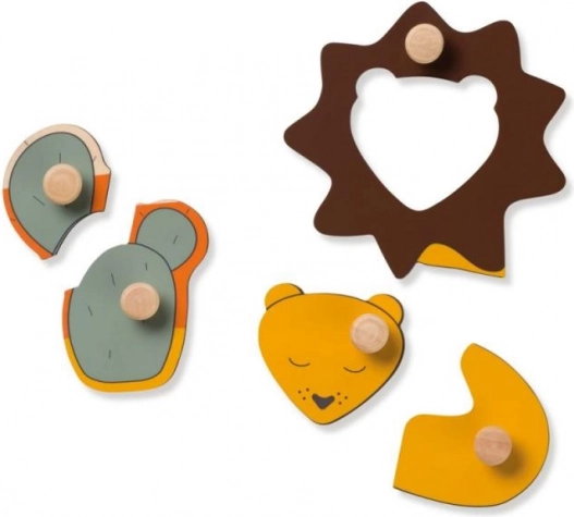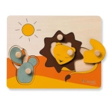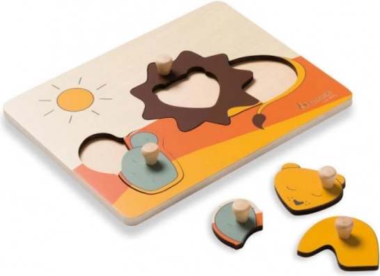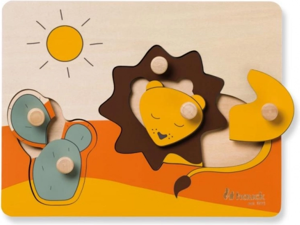 Drevené puzzle Hauck Lion je navrhnuté pre bezpečné a radostné prvé skladanie. Farebné dieliky so zvieratkami a slniečkom majú praktické úchyty, ktoré deťom uľahčia manipuláciu, posilnia úchop a naučia ich správne vkladať tvary na svoje miesta.