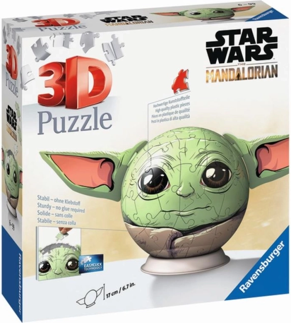 Vstúpte do sveta STAR WARS s originálnym 3D puzzle, ktoré spája obľúbenú postavu Grogu s chytľavou stavebnou výzvou. Vďaka 72 precízne tvarovaným dielikom postavíte hladkú 3D guľu s motívom Mandaloriana a Grogu – bez nutnosti lepidla. Skvelé ako kreatívna voľnočasová aktivita pre deti aj spoločná zábava s rodičmi.