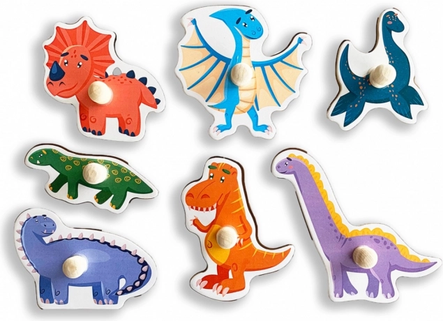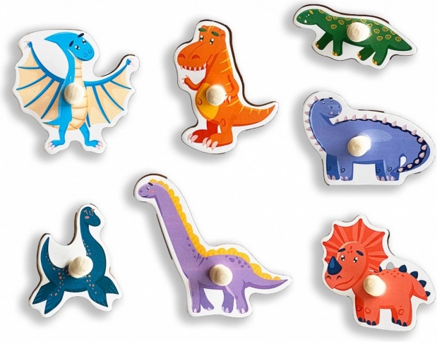 Farebná drevená skladačka s dinosaurami pre najmenších podporuje jemnú motoriku, koordináciu oko–ruka a rozpoznávanie tvarov a farieb. Sedem dielikov s praktickými úchytmi sa vkladá do presne vyfrézovaných otvorov na doske, čo uľahčuje manipuláciu a rozvíja logické myslenie aj vizuálnu pamäť.