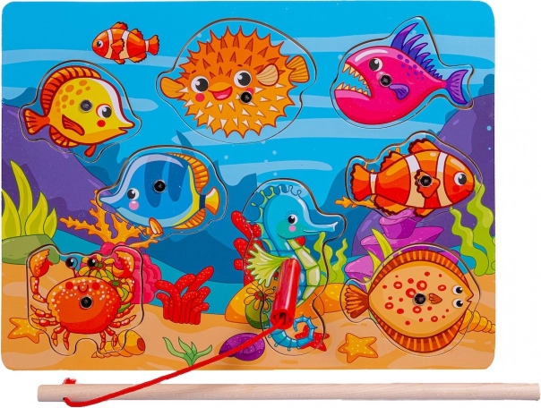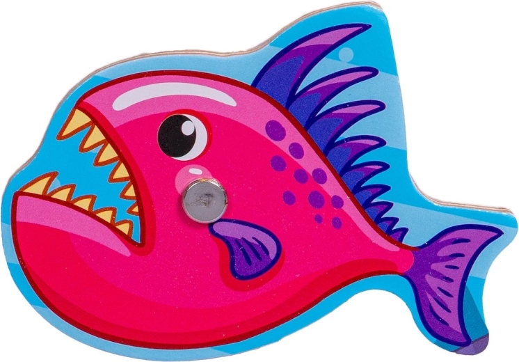 Drevená magnetická skladačka Rybolov prináša deťom radosť z objavovania podmorského sveta. Každý dielik predstavuje morského tvora s očkom na ľahké „ulovenie“ pomocou magnetického prútu. Deti tak trénujú presnosť pohybu a učia sa správne priraďovať tvary do vyznačených otvorov.