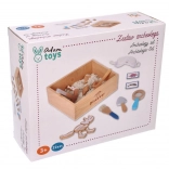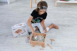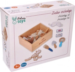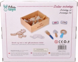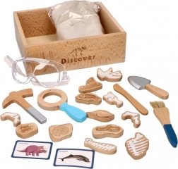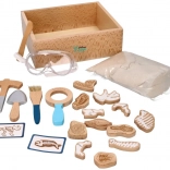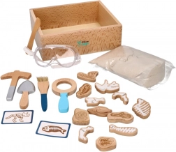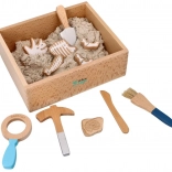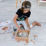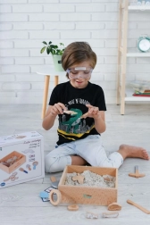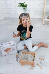 Súčasťou balenia je všetko, čo malý paleontológ potrebuje: od truhličky objaviteľa cez nástroje (kladivko, lupa, nožík, štetček, lopatka) až po kosti dinosaurov, ryby a skameneliny. Dve obojstranné karty pomáhajú ľahko identifikovať vykopané nálezy. Piesok je vyrobený v EÚ a spĺňa bezpečnostné normy.