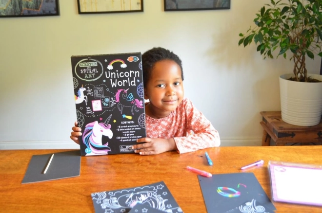 Táto zábavná výtvarná sada s motívmi jednorožcov ponúka hodiny tvorenia pre malých umelcov. Deti môžu pomocou dreveného stylusu odhaľovať farebné vrstvy na škrabacích kartách a vytvárať vlastné žiarivé motívy, alebo skúšať špirálové kreslenie a zdobiť obrázky pestrými detailmi.