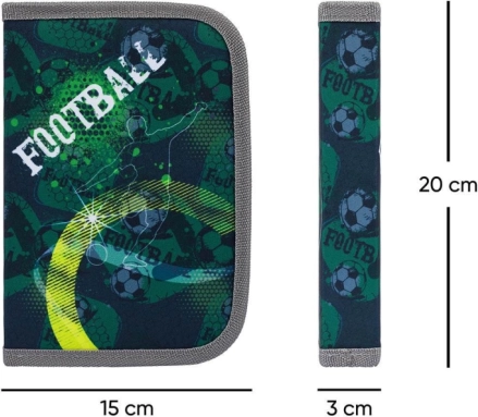 Jednoposchodový školský peračník s motívom futbalu ponúka dostatok priestoru pre všetky vaše školské potreby, ktoré môžete bezpečne uložiť vďaka kvalitnému zipsu. Elegantný dizajn so siluetami futbalistu a lôpt robí z tohto peračníka perfektný doplnok pre milovníkov športu.