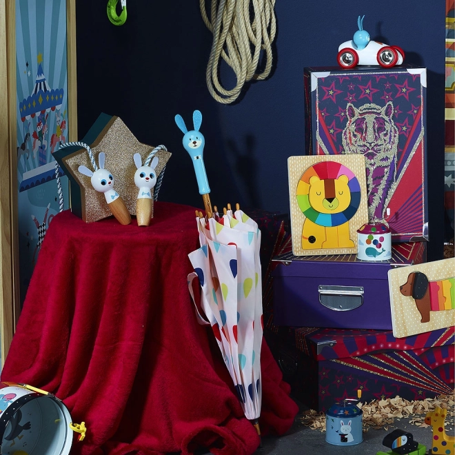 Roztomilý detský dáždnik s postavičkou králika Raoula od značky VILAC má lakovanú drevenú rukoväť v tvare zvieratka a pevnú kovovú konštrukciu. Je ideálny do daždivých dní, dobre sadne do detskej ruky a vďaka kvalitnému spracovaniu vydrží každodenné používanie. Súčasť kolekcie Boizoos – perfektný darček pre najmenších.