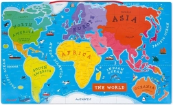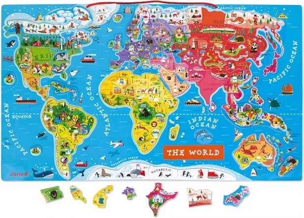 Táto krásna magnetická mapa sveta má rozmery 77 x 46 x 1 cm a obsahuje 92 drevených dielikov puzzle. Každý dielik reprezentuje región alebo krajinu, nesie názov hlavného mesta a obsahuje obrázok charakterizujúci dané miesto, ako sú významné stavby, pamiatky, zvieratá a rastliny. Mapa je v anglickom jazyku a je možné ju zavesiť na stenu, čím sa stáva jedinečným doplnkom detskej izby.