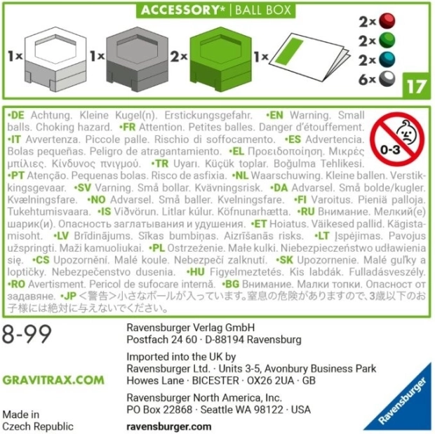 V tejto GraviTrax sade nájdete 12 farebných guľôčok: 6 strieborných, 2 červené, 2 modré a 2 zelené. Guľôčky možno usporiadať podľa farieb alebo ich zamiešať podľa vašej predstavivosti. Súčasťou sady sú tiež 4 krabičky pre usporiadanie guľôčok – 2 zelené, 1 biela a 1 sivá. Tieto krabičky sa dajú skladať na seba, čo umožňuje skladovanie aj v menších priestoroch.