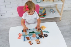 Hračka rozvíja koordináciu ruka-oko a priestorové povedomie tým, že deti umiestňujú zvieracie kúsky do zodpovedajúcich otvorov.