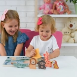 Deti môžu vytvárať príbehy so zvieratami ako žirafa, lev, opica a aligátor, čo podporuje ich kreativitu.