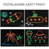 - Kompletná výbava v balení – LED baterka s fluorescenčným fixom, 16 farebných šnúrok v rôznych dĺžkach, tabuľa so suchým zipsom, držiak–pero, farebné filcové tvary s krabičkou a 4 pracovné karty (8 motívov).