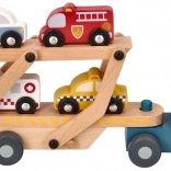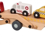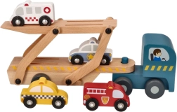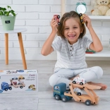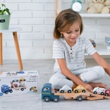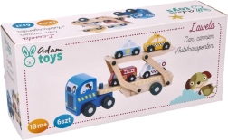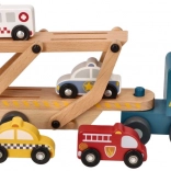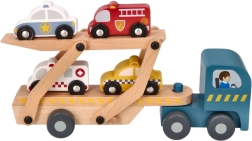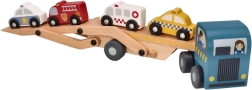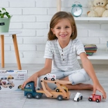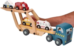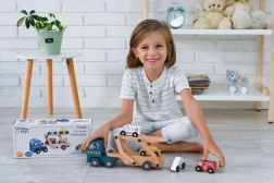 Tento drevený autotransportér ponúka skvelú zábavu pre deti vďaka svojej rozmanitosti a kvalitnému spracovaniu. Obsahuje odnímateľný príves, ktorý pojme štyri rozkošne zafarbené drevené vozidlá.