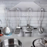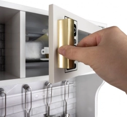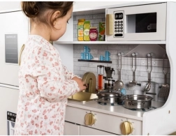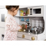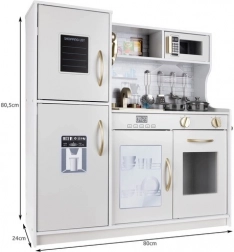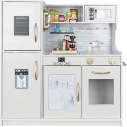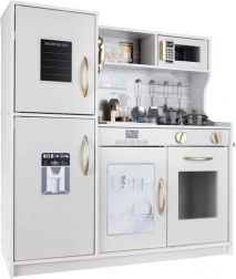 Táto drevená kuchynka XL je navrhnutá pre dlhé hodiny zábavy. Integrované LED podsvietenie umiestnite podľa ľubovôle pod skrinku, do skrinky alebo do rúry a otočné prepínače s cvakaním navodia dojem skutočného varenia. Robustná MDF konštrukcia a elegantné bielo‑zlaté prevedenie sa stanú ozdobou detskej izby.