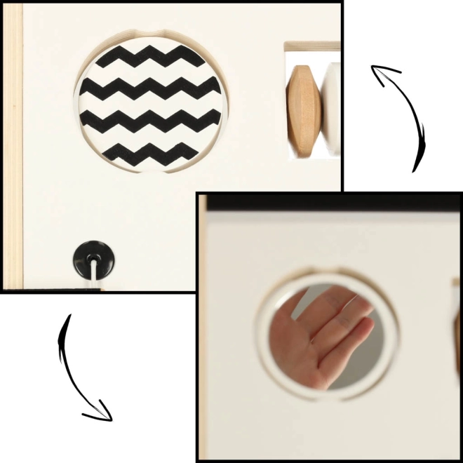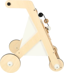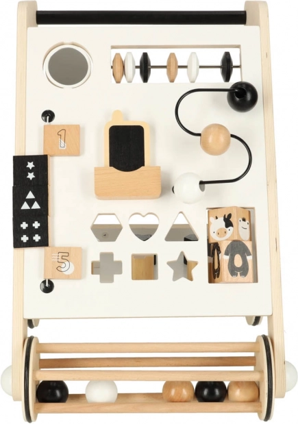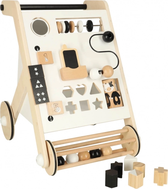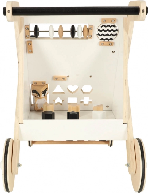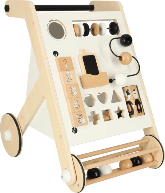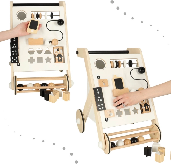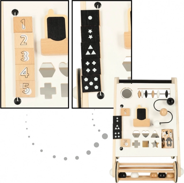 Chodítko obsahuje posuvné guličky, triedenie tvarov a rotačné bloky, ktoré podporujú jemnú motoriku a koordináciu.