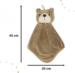 Tento detský uterák s motívom medveďa je navrhnutý špeciálne pre deti. Jeho kompaktné rozmery 25 x 42 cm sú ideálne pre malé detské ruky, čo zabezpečuje jednoduchú manipuláciu a použitie. Uterák je vybavený praktickým pútkom na zavesenie, čo uľahčuje jeho umiestnenie na háčik na dosah rúk dieťaťa.