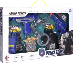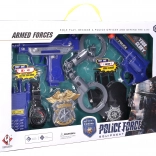 Súčasťou balenia je kompletná výbava: samopal a pištoľ s dĺžkou 18 cm, praktické puzdro na pištoľ, funkčné putá s kľúčom, štýlová vysielačka, hodinky a policajný odznak. Batérie sú v balení, takže nemusíte nič dokupovať.