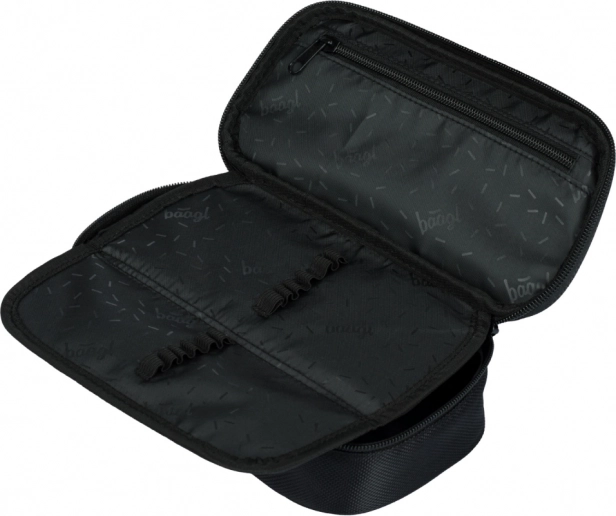 Vybavený je pružným pásikom pre uchytenie ceruziek alebo pier a má podšívku s opakovaným motívom značky 'baagl'.