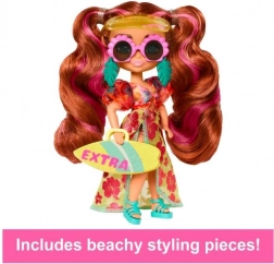 Plážové doplnky dodajú každej hre šmrnc – slnečné okuliare v tvare ružových mušlí, štýlová šatková čelenka a šiltovka ladia s kabelkou pripomínajúcou surf. Priložený stojan umožní bábiku stabilne vystaviť a vytvárať zberateľské scénky.