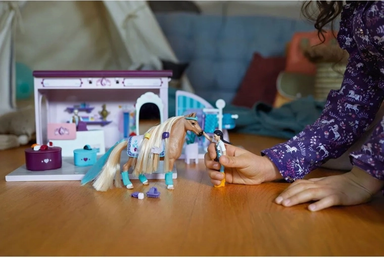 Skladací koníkový salón z kolekcie Schleich HORSE CLUB Sofia's Beauties je ideálny pre všetkých milovníkov koní. Ponúka úžasné deky a doplnky v niekoľkých farbách, takže si každý kôň príde na svoje. Viete, že hrivu a chvost koní môžete nielen česať a upravovať, ale aj jednoducho zamieňať? Vďaka tomu Sofia a jej kobylka nemusia zotrvávať pri jednej úprave. Je dokonalý na akúkoľvek fotografickú akciu, aj keď je to trebárs len na dvore. Set jednoducho zložíte a na cesty zase rozložíte.