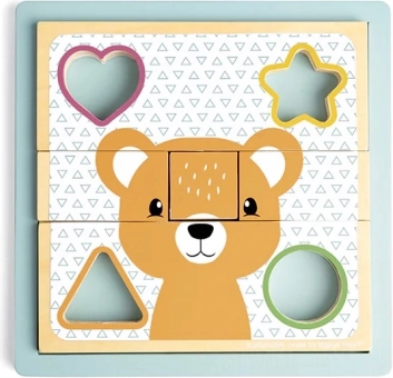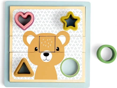 Toto všestranné drevené puzzle je na prvý pohľad triediaca hra, no pri bližšom skúmaní odhalí svoju druhú tvár – skladačku s prekvapivými obrázkami. Otočte jednotlivé dieliky, skladajte ich do správnych výrezov a poskladajte roztomilého medvedíka alebo líšku. Vďaka kombinácii dreva a príjemného silikónu sa s dielikmi ľahko manipuluje a vydržia aj náročnejšie detské zaobchádzanie.