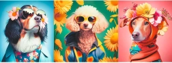 Objavte hravý svet psiej módnej prehliadky v pestrých farbách a pôsobivom panoramatickom formáte. Štýlovo oblečení psíci so slnečnými okuliarmi a kvetmi premenia skladanie na zábavný zážitok a hotový obraz sa stane originálnou dekoráciou.