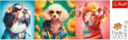 Traja štýlovo oblečení psi so slnečnými okuliarmi a kvetmi na farebnom pozadí vytvoria hravý obraz, ktorý rozžiari každý interiér.