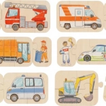 Táto sada obsahuje šikovné trojice dielikov s motívmi obľúbených vozidiel a ich vodičov. Deti skladajú správne kombinácie, pritom si precvičujú jemnú motoriku a učia sa rozpoznávať farby aj číslice. Vďaka pevnému drevenému prevedeniu sú puzzle odolné a príjemné na dotyk.