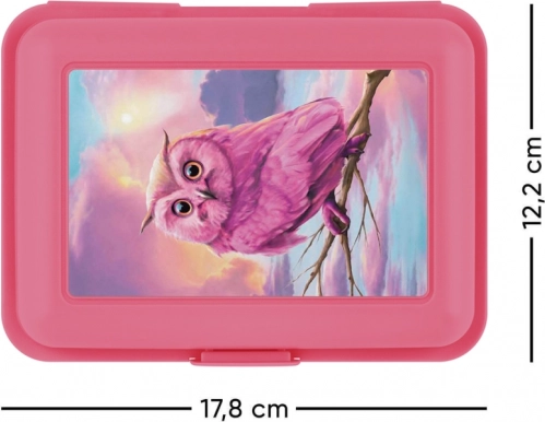 Sova v ružovej farbe je krásne znázornená na boxe, čo robí z každého jedla zábavu.