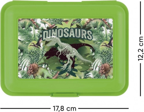 Desiatový box BAAGL Dinosaurs v zelenej farbe je ideálnou voľbou pre deti vďaka svojmu atraktívnemu dizajnu s dinosaurami a praktickému prevedeniu s deliacou priehradkou.