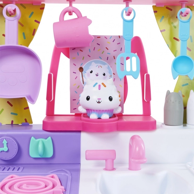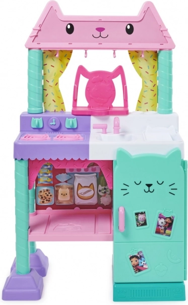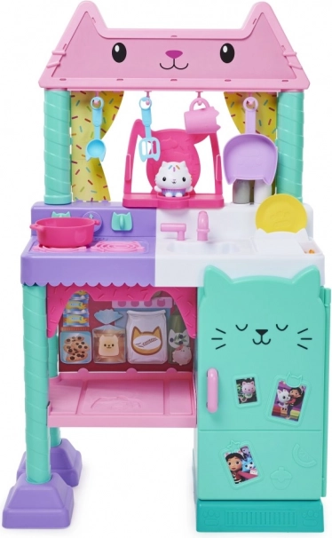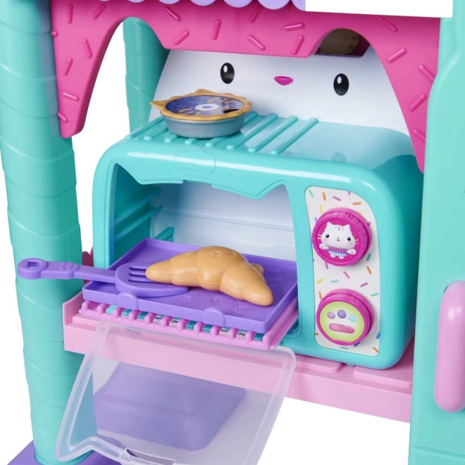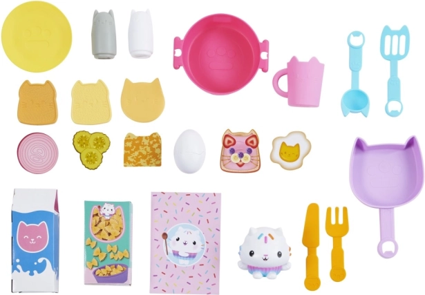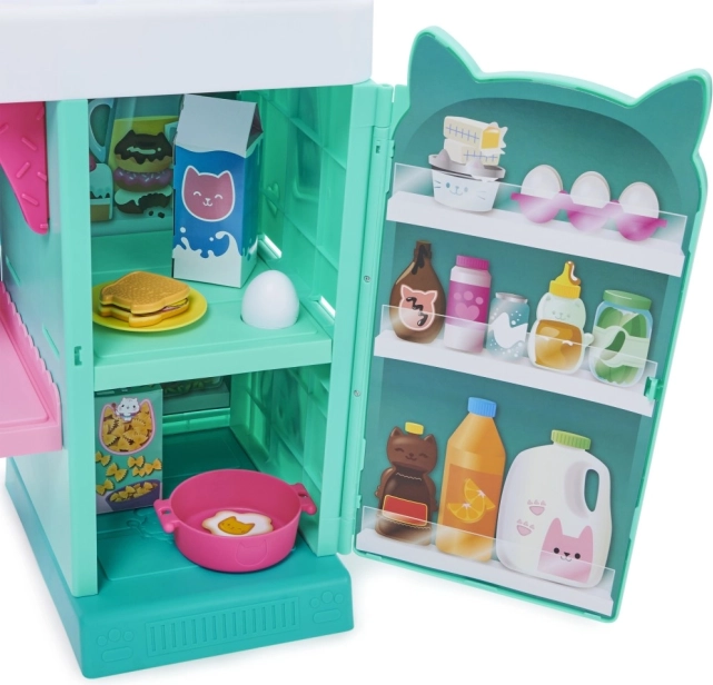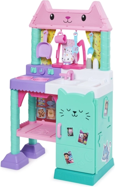 Predstavujeme kuchynskú sadu Cakey Cat Kitchen pre deti zo sveta Gábikiného kúzelného domčeka. Táto herná kuchynka je skvelým doplnkom do série hračiek Gábikin kúzelný domček pre dievčatá aj chlapcov s viac než 20 kuchynskými doplnkami a výškou cez 91 cm. Dortíková kuchyňa je vybavená sporákom, drezom s odkvapkávačom, 10 kuchynskými doplnkami a riadom, vešiakmi nad okno, 9 potravinami na hranie a chladničkou s fotkami Gábiky a jej mačičiek, v ktorej si môžete odkladať hracie potraviny, príslušenstvo a ďalšie hračky. Nádherná kuchynka tiež obsahuje veľkú figúrku mačky Dortíka so špeciálnym stojanom, ktorý možno pripevniť na okno, aby mohol Dortík sledovať vaše kuchynské výtvory. Stlačte tlačidlo na Dortíkovom stojane a otočte gombíkmi sporáka na aktivovanie viac než 20 zvukov a fráz a 9 zvukových efektov varenia, 3 hudobných čísel a 11 Dortíkových hlášok z obľúbeného seriálu Gábikin kúzelný domček na Netflixe. Ak si chcete malú kuchynku ešte trochu rozšíriť, pod sporákom je polička navrhnutá špeciálne pre rúru Bakey with Cakey Oven (predáva sa samostatne). Dortíkova kuchynská herná sada je nevyhnutným doplnkom pre všetkých fanúšikov Gábikiného kúzelného domčeka, ktorí si vďaka nej môžu prehrávať scény zo svojich obľúbených programov o varení alebo pripravovať vlastné kuchárske výtvory pre rodinu a priateľov.