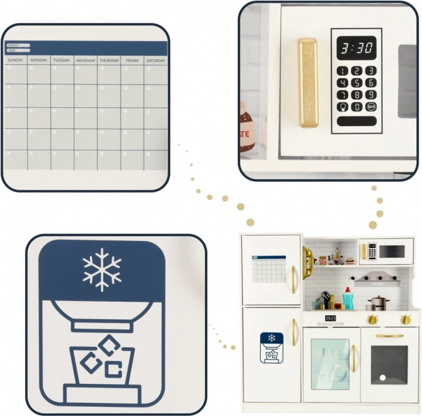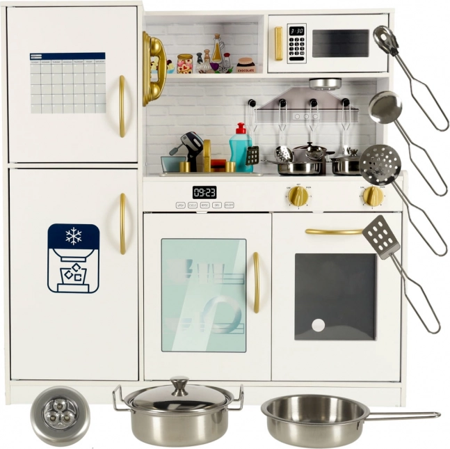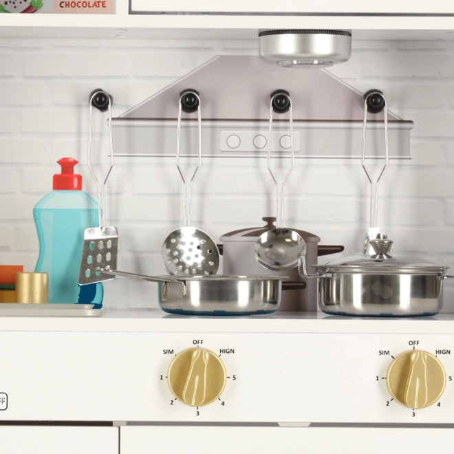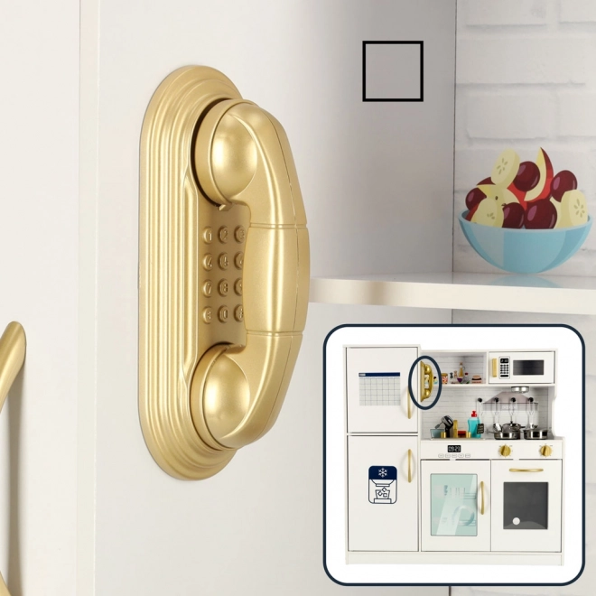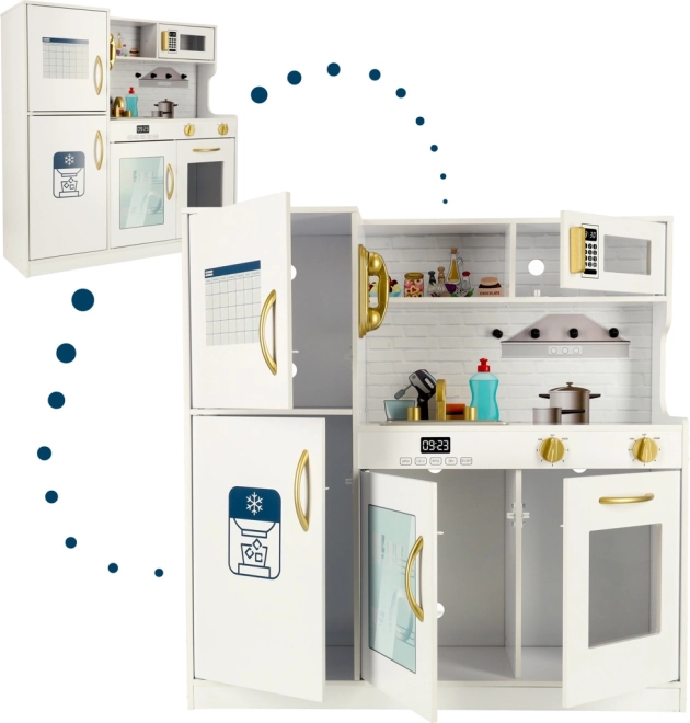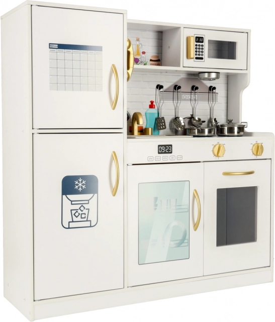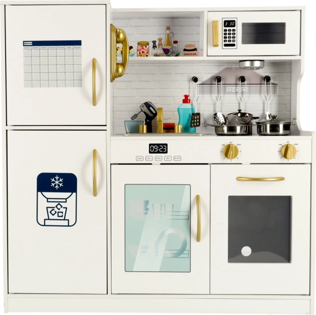 Biely farba kuchynky so zlatými prvkami sa dokonale hodí do každého detského izby a poskytuje nielen priestor na hranie, ale aj efektívnu dekoráciu. Kuchynka je vyrobená z pevného a hladko opracovaného dreva, čo zabezpečuje jej dlhú životnosť.