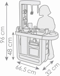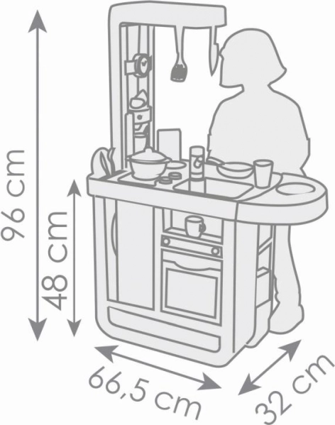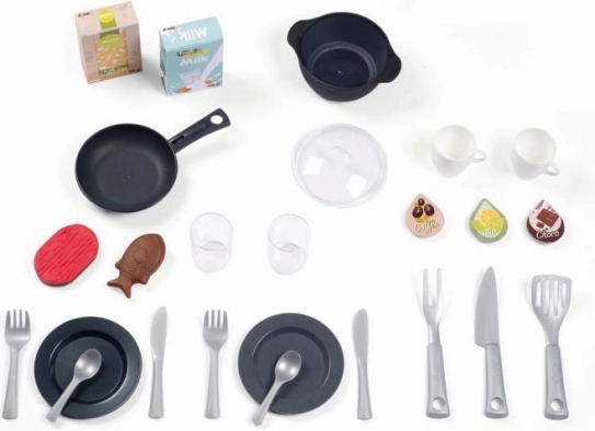 Tento kuchynský set obsahuje drez s kohútikom, chladničku a espresso kávovar s kapsulami na čaj a kávu. Navyše, súčasťou setu sú realistické modely jedla ako mäso a ryby, ktoré majú dve rôzne strany, surovú a smaženú. Rozsiahle príslušenstvo zahŕňa aj rendlík s pokrievkou, taniere, príbory, riad a ďalšie. Všetko možno ľahko uložiť do praktických políc alebo využiť malý stolík na hru.
