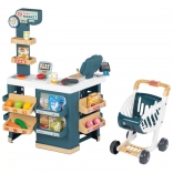 Supermarket s pokladňou, oddelením ovocie/zelenina, váhou (nová mechanická váha: zobrazená hmotnosť sa upravuje podľa vážených potravín). Dieťa môže nastavovať hodiny a panel otvorené/zatvorené. Obsahuje 42 doplnkov: cestoviny, sušienky, cereálie, mlieko, 6 kusov ovocia a zeleniny, 1 koláč, 2 makrónky, 2 plechovky, 1 elektronický snímač čiarových kódov so zvukom a svetlom, 1 kreditná karta, 4 účtenky, 9 mincí a 12 bankoviek. Pokladňa má zásuvku na peniaze, mikrofón a čítačku kreditných kariet. Vozík súčasťou.