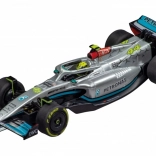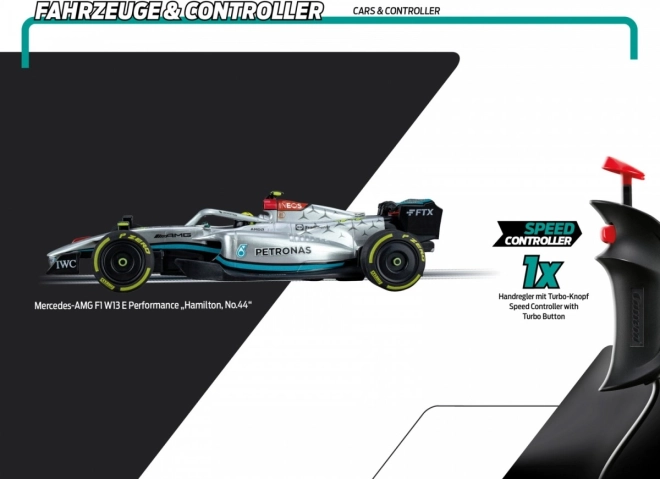 Detailne spracované vozidlo Lewisa Hamiltona s aerodynamickým tvarom a autentickými logami prináša verný pocit z pretekov F1 na domácej trati.