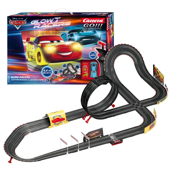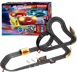 Rodinná zábava aj poctivý pretekársky adrenalín – to je CARRERA GO v edícii Disney-Pixar Cars. Dve detailne spracované autá Blesk McQueen a Jackson Storm vo verzii GLOW Racer zažiaria na trati plnej výziev: looping, zvislá stena aj klopené zákruty zvládnu vďaka magnetu a dvojitým kefkám s prehľadom. Na okamžitý šprint do vedenia slúži funkcia Turbo na oboch ovládačoch.