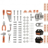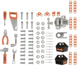 - 75 príslušenstiev vrátane 7 nástrojov: skrutkovač, kladivo, píla, kľúče (plochý a nástrčný), kliešte, zverák, skrutky, klinčeky a matice.
