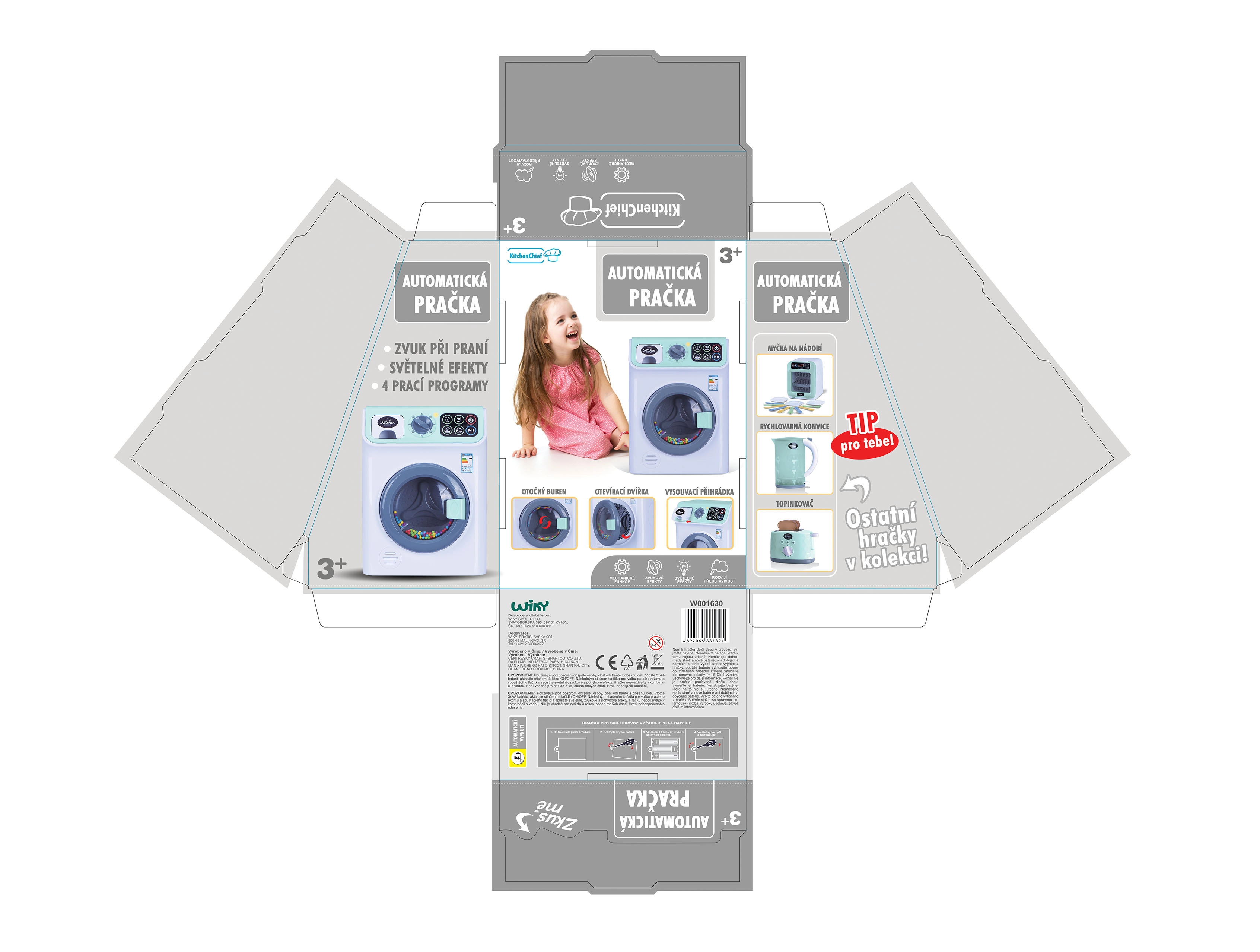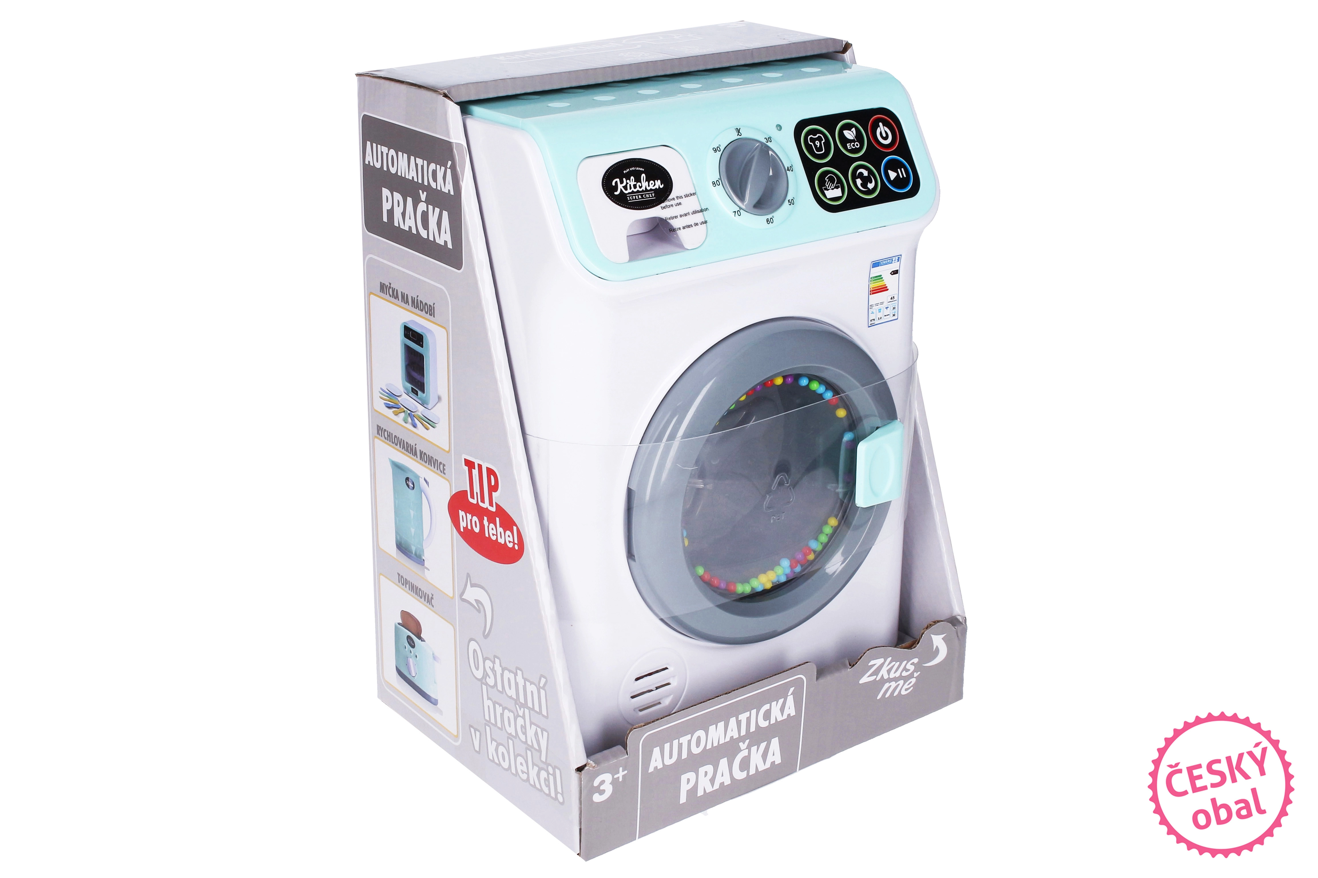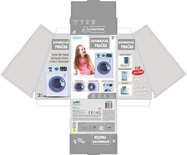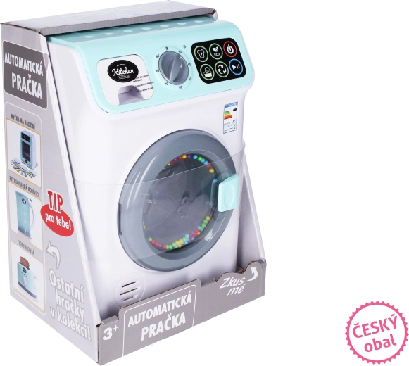 Táto detská práčka prináša deťom autentický zážitok z prania – stačí naplniť bubon, zvoliť program a teplotu, pridať prací prášok a zapnúť. Bubon sa skutočne otáča a všetko sprevádzajú realistické svetelné a zvukové efekty, vďaka ktorým je hra ešte zábavnejšia.