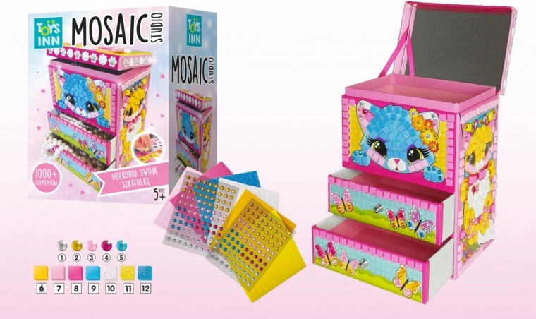 Krabička s dvomi zásuvkami je ideálnym miestom na uloženie cenných drobností. Zábava spočíva v tom, že si ju sami vyzdobíte. Stačí priradiť farebné prvky k zodpovedajúcim číslam a tešiť sa z výsledku svojej tvorivej práce. Skrinka je tiež vybavená zrkadielkom, ktoré je umiestnené na vnútornej strane veka.