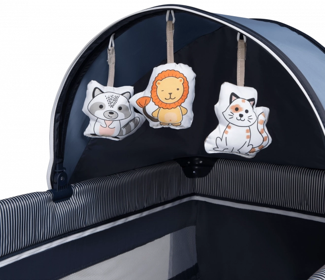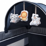 Bohaté príslušenstvo zvyšuje komfort dieťaťa aj rodičov: priložená sieťka proti hmyzu chráni počas spánku, prebaľovací pult a bočný panel s tromi vreckami udržia nevyhnutnosti po ruke. Interaktívne prvky ako melódie a roztomilý psík zabavia bábätko, madlá napomáhajú učeniu státia. Kvalitná mäkká podložka je odolná proti oderom a ľahko sa udržiava.
