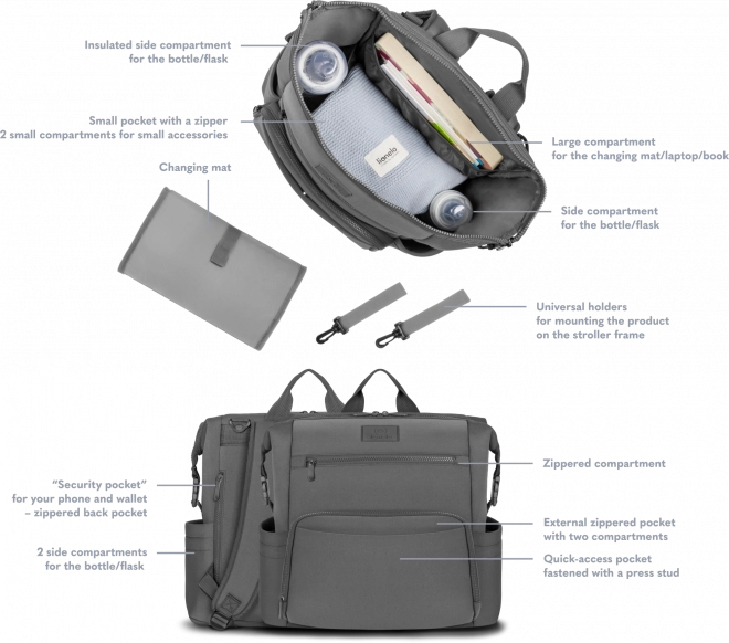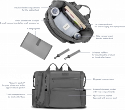 Premyslené členenie ponúka rýchly prístup ku všetkým nevyhnutnostiam pre bábätko aj rodičov. Univerzálne pracky umožnia ľahké pripevnenie ku kočíku a pomocné popruhy zas upravia veľkosť tak, aby sa batoh vošiel aj pod sedadlo v lietadle.